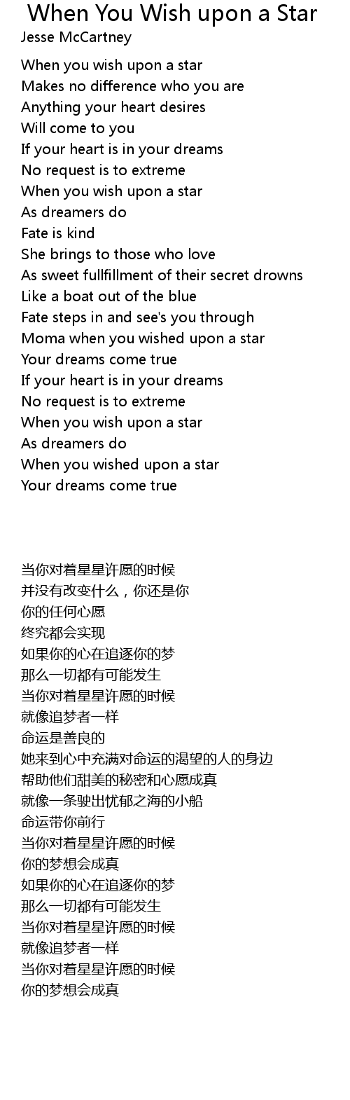When You Wish Upon a Star is a featured article, which means it has been identified as one of the best articles produced by the Disney Wiki community If you see a way this page can be updated or improved without compromising previous work, please feel free to contributeIf I Never Knew You;When you wish upon a star Makes no difference who you are Anything your heart desires Will come to you If your heart is in your dreams No request is to extreme When you wish upon a star As dreamers do Fate is kind She brings to those who love As sweet fullfillment of their secret drowns Like a boat out of the blue Fate steps in and see's you